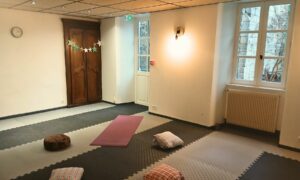 Une salle vitrée avec sol souple attenante à la grande salle du café associatif